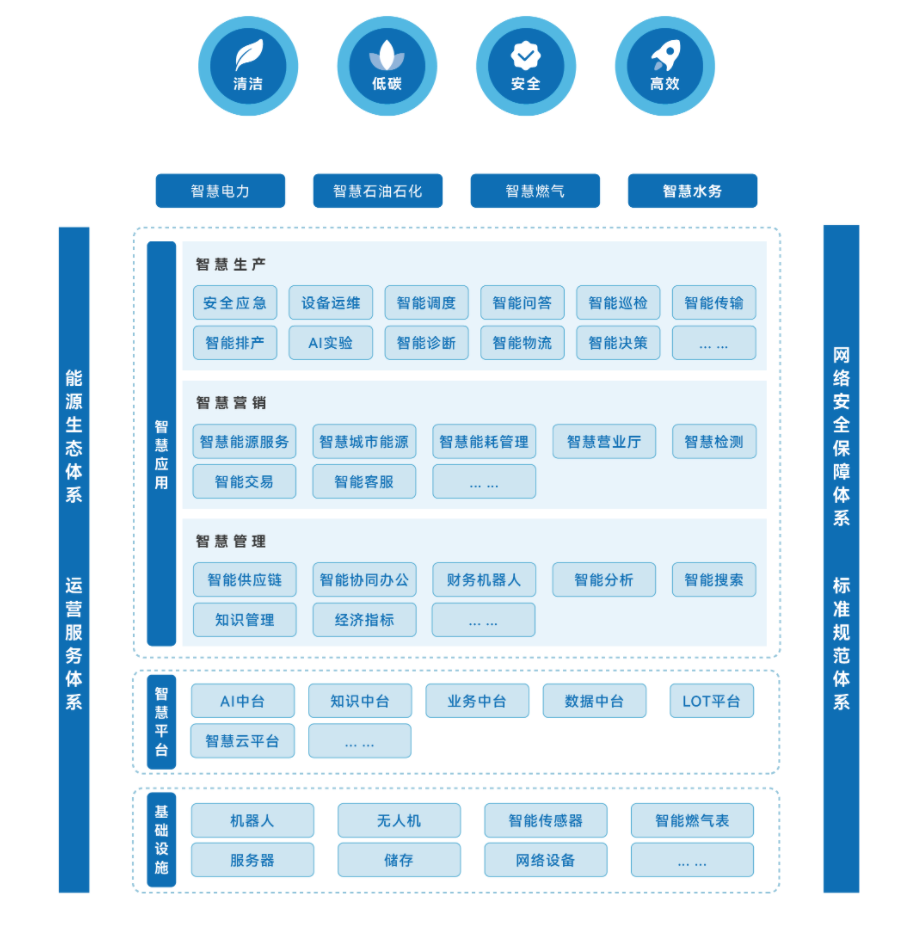 智慧能源解决方案以智能化为核心,满足石油、电力、水务等能源行业的智慧管理需求,采用控、管、维一体化技术架构,多网络融合及人工智能技术,实现数据可视化、信息图形化、控制智能化。